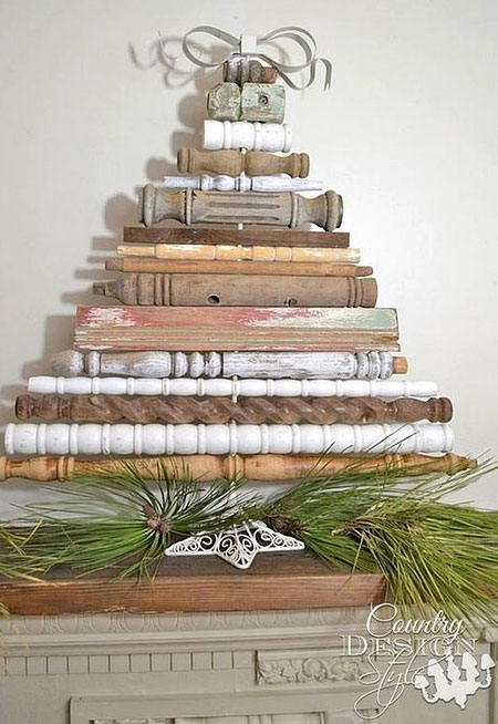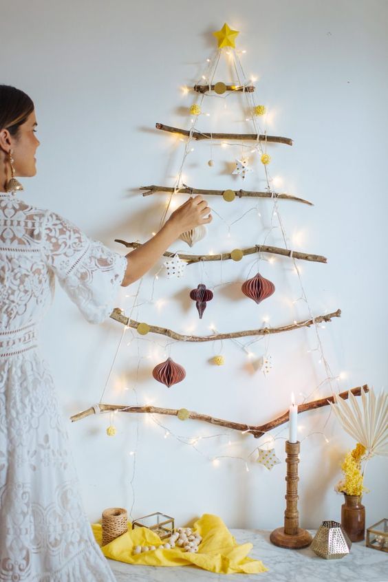 Это известная идея – сформировать из палок разной длины елку, повесить на стену, украсить огоньками – и дальше игрушками под любой вкус, настроение и интерьер.