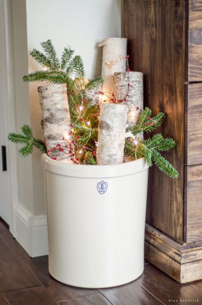 Собираем композицию из березовых веток, лапника красных ягод и гирлянды, помещаем в высокое кашпо, ведерко или даже зонтницу. Ставим на видное место.
