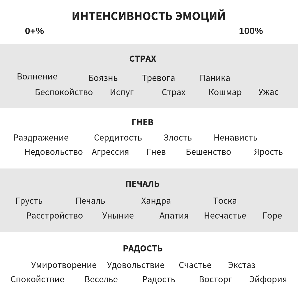 Таблица эмоций поможет вам сформировать ваш внутренний эмоциональный словарь. Базовых эмоций 4, а остальные – это производные с разной степенью интенсивности. Страх и гнев — эмоции, изначально связанные с выживанием. Печаль и радость — эмоции, связанные с удовлетворенностью или неудовлетворенностью наших потребностей.