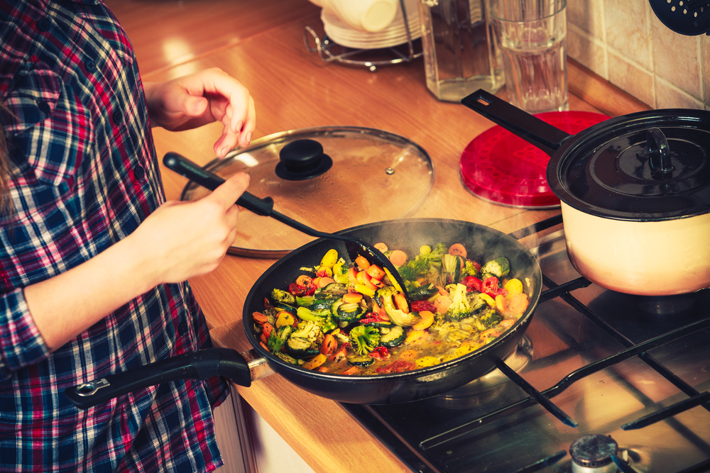 Во время ужина постарайтесь сократить количество мяса и сделать овощи, которые обычно считаются гарниром, основным блюдом, пусть они занимают, как минимум, половину тарелки. Подумайте о таком варианте: небольшая порция говядины травяного откорма или дикого лосося с большой порцией запеченной брюссельской капусты, сладкого картофеля и свеклы – все приготовлено на одном противне. Другие варианты блюд с большим количеством овощей? Любые овощи, приготовленные способом stir fry (быстро обжарить на сильном огне при постоянном помешивании). А если вы ужинаете в кафе или ресторане, и в меню мало основных блюд из овощей, вы всегда можете придумать свое собственное, скомбинировав несколько овощных гарниров.