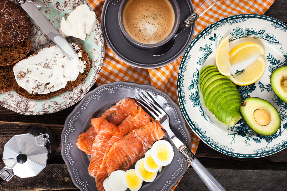 Утром теперь жиры и белки: обычно это яйца в самых разных вариациях, плюс овощи и зелень, семена, семга или хумус, авокадо и разные виды масел. И чашка черного кофе со специями.