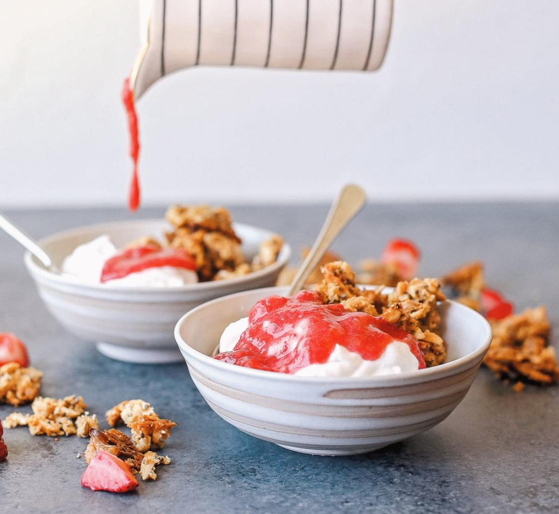 4. Сервировка: Положите йогурт в миску, сверху полейте клубничным топингом или украсьте свежими фруктами и посыпьте гранолой.