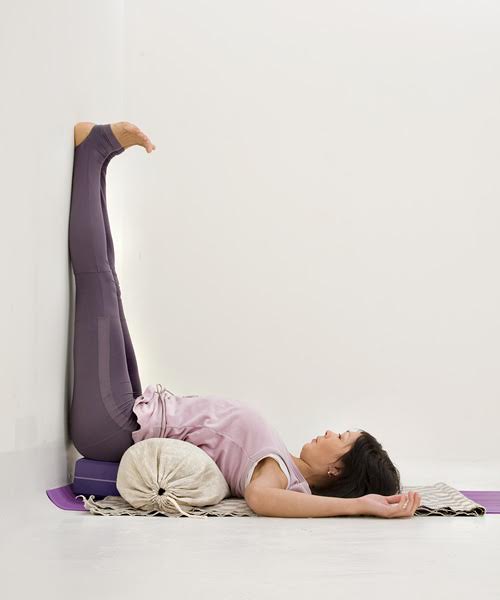 Поставьте у стены кирпич, накрытый одеялом, и болстер. Сядьте на опору боком к стене, согните колени. Затем откиньтесь назад и одну за другой вытяните ноги вдоль стены, чтобы задняя поверхность ног прикасалась к стене. Изогнитесь так, чтобы максимально раскрыть и приподнять грудную клетку. Следите, чтобы прогиба не было в пояснице. Руки и плечи согнуты, свободно лежат на полу. Под голову можно подложить небольшое одеяло (это необходимо, если у вас повышенное давление). Можно согнуть ноги, скрестив их в голенях. Оставайтесь в позе 5-10 минут. Затем осторожно сползите на пол с опоры, полежите, и, повернувшись набок, встаньте.