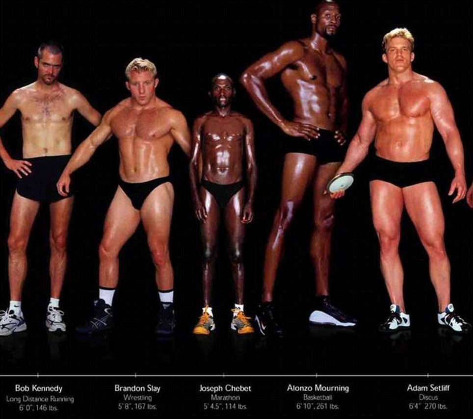 Классификация ИМТ ошибочна еще и потому, что люди естественным образом отличаются по размеру и фигуре. Это красноречиво показывает альбом фотографа Говарда Шатца «Спортсмен» (Athlete), выпущенный в 2002 году. В нем собраны фотопортреты участников и участниц Олимпийских игр, и каких только форм и размеров там не увидишь! Каждый из них – от миниатюрной гимнастки до самого массивного тяжеловеса – воплощает пик физической подготовки в своем виде спорта. Лики здоровья многообразны, кому-то для хорошего самочувствия нужен ИМТ пониже, а кому-то, наоборот, повыше.