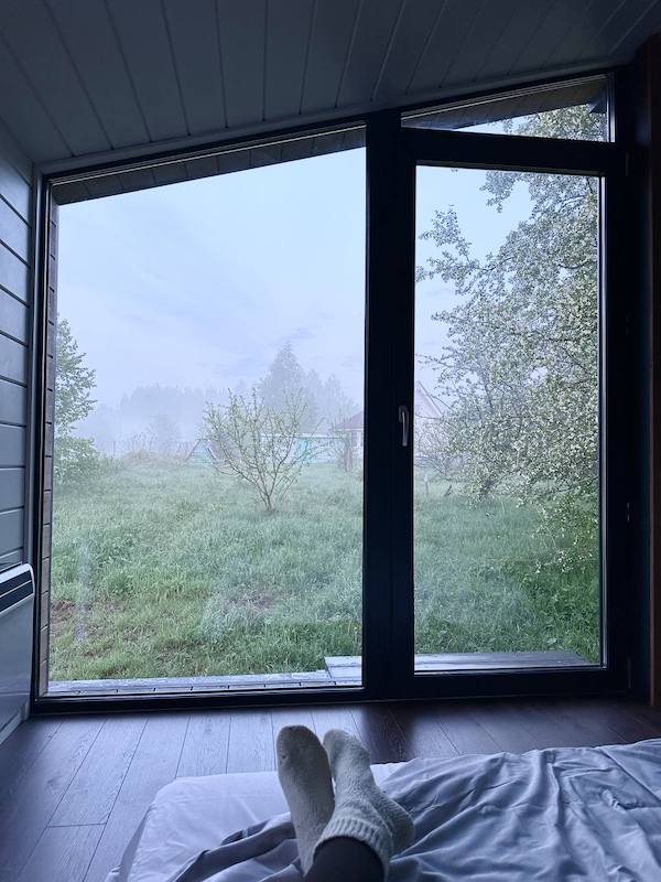 Кристина исполнила классику советского периода и свои авторские композиции. Гости расположились в шезлонгах, кутаясь в пледы, и слушали, как музыка мягко перекликается с шелестом сосен. Когда зазвучала «Нежность», лес будто притих, и на лицах у многих промелькнула та самая улыбка, в которой смешаны радость и лёгкая грусть. После выступления мы зажгли огонь в костровой чаше, и вечер перешёл в танцы под Gogol Bordello и даже Depeche Mode.