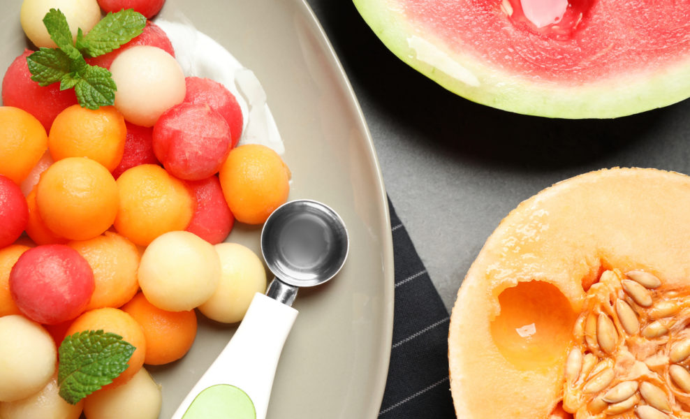 - Наузеткой (или просто ножом) режем дыни и арбуз до тех пор, пока не получится где-то 3 чашки (250 мл объём) арбузных шариков (или кубиков) и 4 чашки дыни.