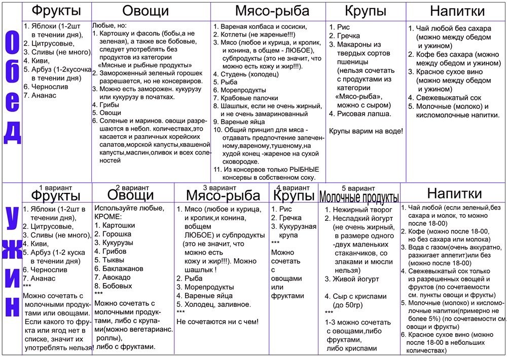 На обед – суп, мясо, овощи, крупы. Ограничить картошку, исключить жареное.