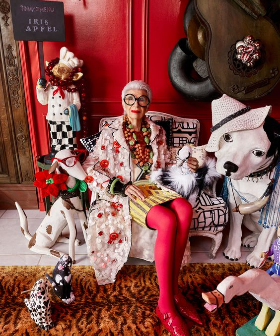 Айрис Апфель известна своими яркими образами, плюс неизменные большие очки, плюс красная помада, плюс выдающиеся аксессуары, плюс юмор и постоянная игра – с цветами, эпохами, фактурами, традициями. «Я — самый старый в мире подросток», — говорит она про себя.