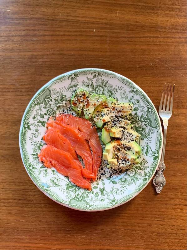 Авокадо порезать на дольки. Полить оливковым и льняным маслом 50/50 и лимонным соком. Посыпать обжаренными кунжутными семенами. Малосолёная красная рыбка в сочетании с авокадо – очень вкусно!
