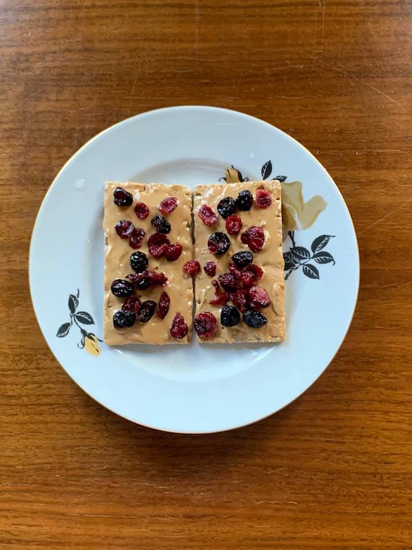 - Тост или хлебцы (лучше тост из белково-полбяного хлеба) с арахисовой пастой