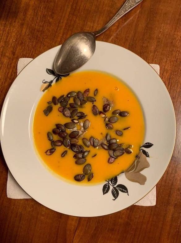 Отварить одну среднюю картофелину, морковь и тыкву. Морская соль, чёрный перец свежий или сухой имбирь по вкусу. Готовые овощи с небольшим количеством бульона и парой ложек кокосового молока взбить в блендере. При подаче суп посыпать обжаренными тыквенными семечками.