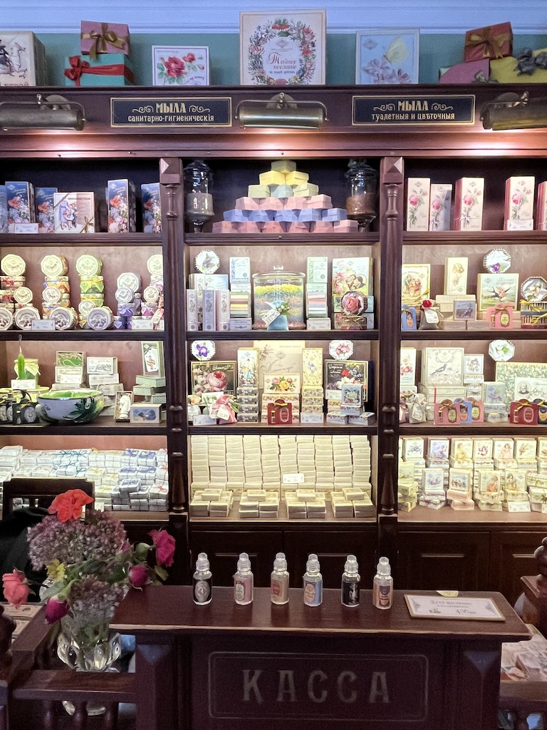 Две соседние двери с нарядными вывесками ведут на ароматный и вкусный шопинг, который также можно совместить с экскурсиями (по предварительной записи). Музей-Мануфактура «Душистыя радости» — это воссозданная лавка Григория Ивановича Суранова (да-да, одного из династии), который занимался мыловаренным делом в Коломне в конце XIX века. Здесь огромный выбор ретро-коробочек с мылом, сваренным по традиционным рецептами, и разными приятными сувенирами. Рядом находится Музей «Кондитерская кухмейстера П.П.Шведова» — в лавке покупаем шоколад по рецептам XIX века и конфеты ручной работы в роскошных музыкальных коробочках.