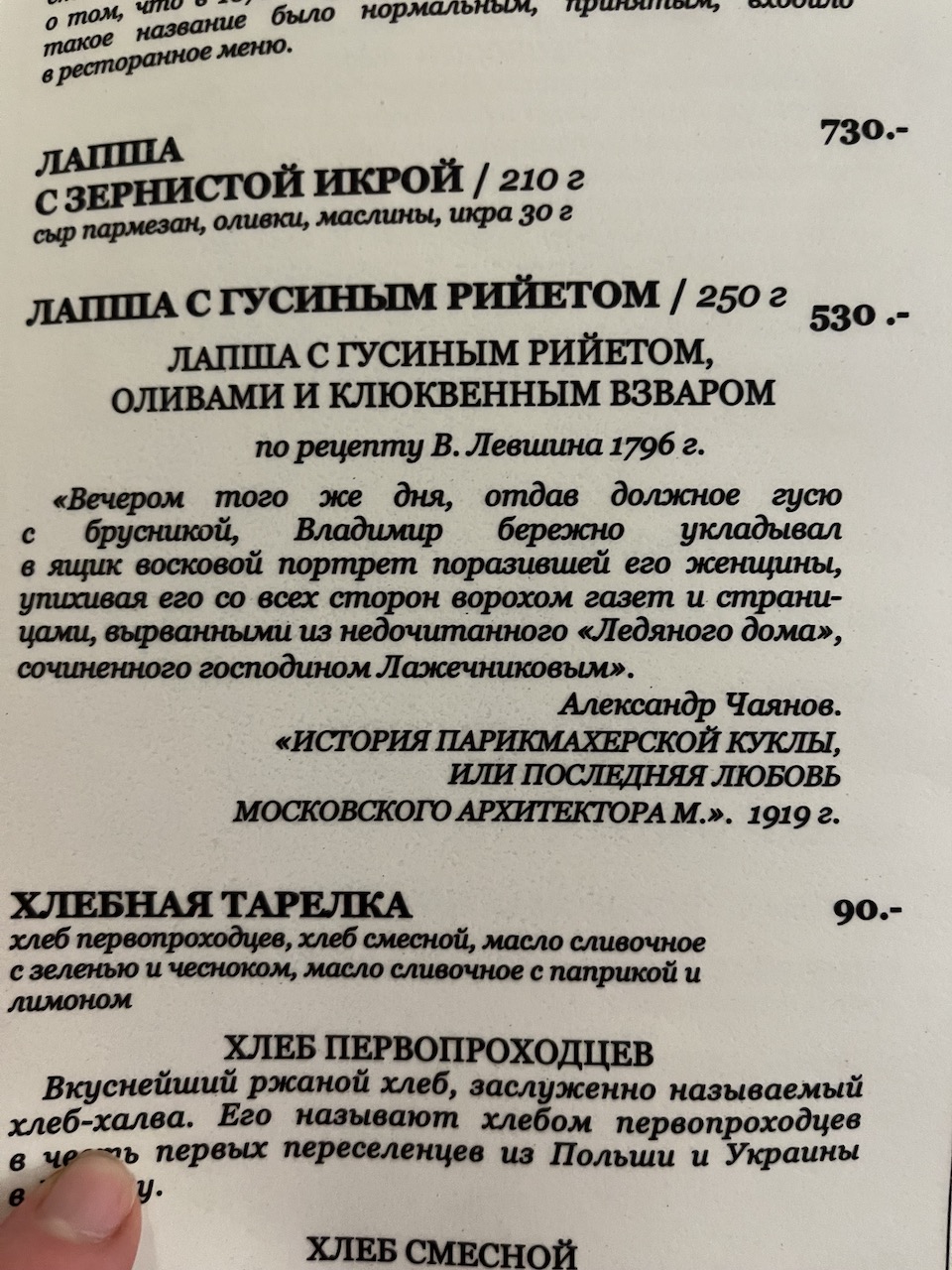 Обедать и/или ужинать – только здесь, выбирая блюда по русским рецептам из меню, собранного по мотивам произведений писателя-романиста и уроженца Коломны Ивана Ивановича Лажечникова и других литературных гениев места. Здесь подают английский завтрак по Карамзину, судака с томлеными яблоками с цитатой из Салтыкова-Щедрина, чай по Достоевскому, блины по Чехову и яснополянский пирог Анке. Невозможно вкусно все.