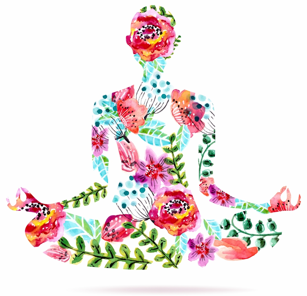 Yoga pose, watercolor bright floral illustration