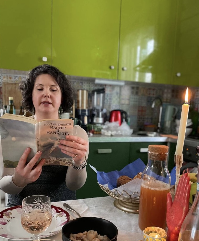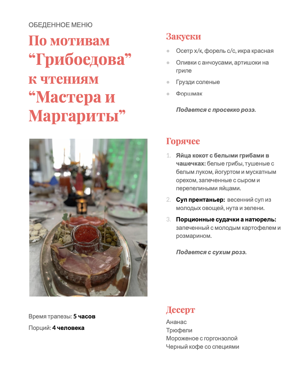 И очень серьезно отнеслись к меню – составили его по мотивам ресторана «Грибоедов», что упоминается в романе. С части про «филейчики дроздов» и начали чтения, усевшись за накрытый стол.