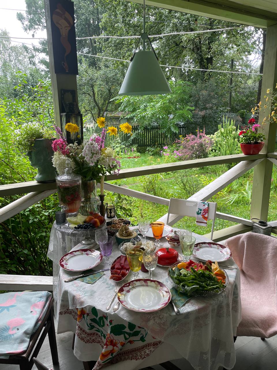 По очереди читать, рефлексировать, быть в творчестве, смеяться, обогащаться друг о друга. Ну, и конечно, красиво сидеть, вкусно есть и звонко чокаться: сервировала стол бабушкиными сервизами и хрусталем. Решили, что примерно так и выглядело дачное времяпрепровождение столетней давности.