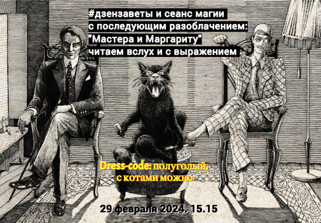 После нашумевшего фильма «Мастер и Маргарита» решили, что станем в нашей литературной гостиной читать Булгакова. Как раз дата была подходящая для чтений мистического романа – 29 февраля. Поиграли в то, что пусть будет «полуголая вечеринка» и что «с котами можно».