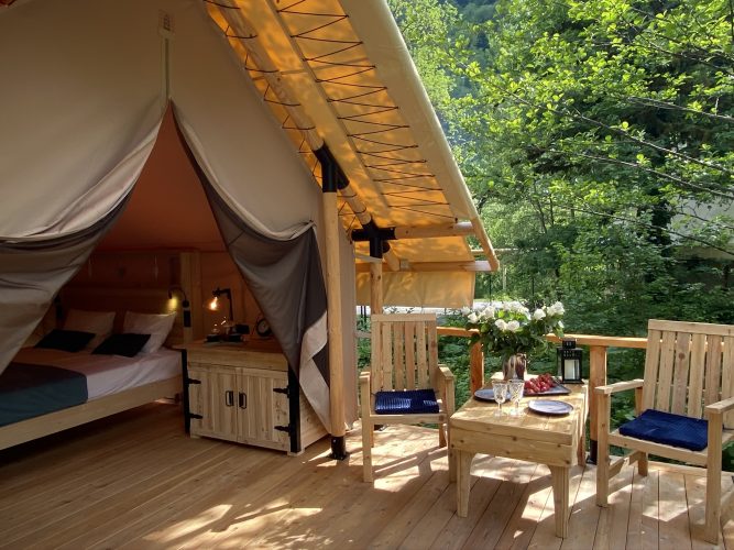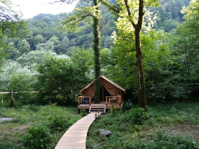 Глэмпинг «Лес» расположен неподалеку от реки Чвижепсе. Название реки переводится как «вода, дающая радость». И это действительно так, в долине реки находится месторождение минеральной воды, которая оказывает положительное воздействие на желудок и кровообращение. По вкусу эта вода похожа на «Нарзан». Пока едешь из Сочи в горы, успеваешь полюбоваться природой. Но особая красота открывается в непосредственной близости от глэпминга. Он окружен реликтовым лесом, и древность деревьев буквально чувствуешь кожей. Появляется ощущение, что ты не в Сочи, а в каком-то сказочном месте.