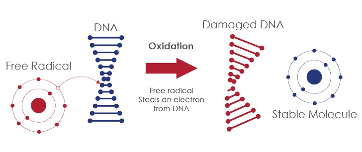 Окислительным стрессом или окислительным повреждением называется процесс, когда клетка становится неспособна выполнять свои функции в результате повреждения или гибели. Это происходит благодаря действию активных форм кислорода (АФК), или свободных радикалов, которые образуются при контакте УФ излучения с кожей. АФК очень реактивны, имеют большую повреждающую способность и нестабильны из-за наличия непарного электрона.