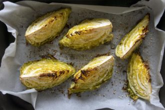 Добавление песто из свежих трав уравновешивает запеченную солоноватую капусту. При желании, для песто можно использовать любую зелень, что найдется у вас в холодильнике.