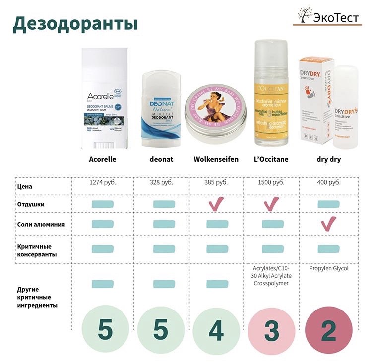 Acorelle и Деонат вне конкуренции, второй – это тот самый «кристалл», квасцы, которые не допустят вредительства алюминия.Крем-дезодорант Wolkenseifen “грешит» отдушкой, а L’Occitane разочаровал не только ароматизатором, но и микропластиком в составе. А вот популярный Dry Dry, который, судя по комментариям, многим обеспечил сухие подмышки, оказался обладателем солей алюминия и, к тому же, нефтехимического увлажнителя. Категорическое нет.