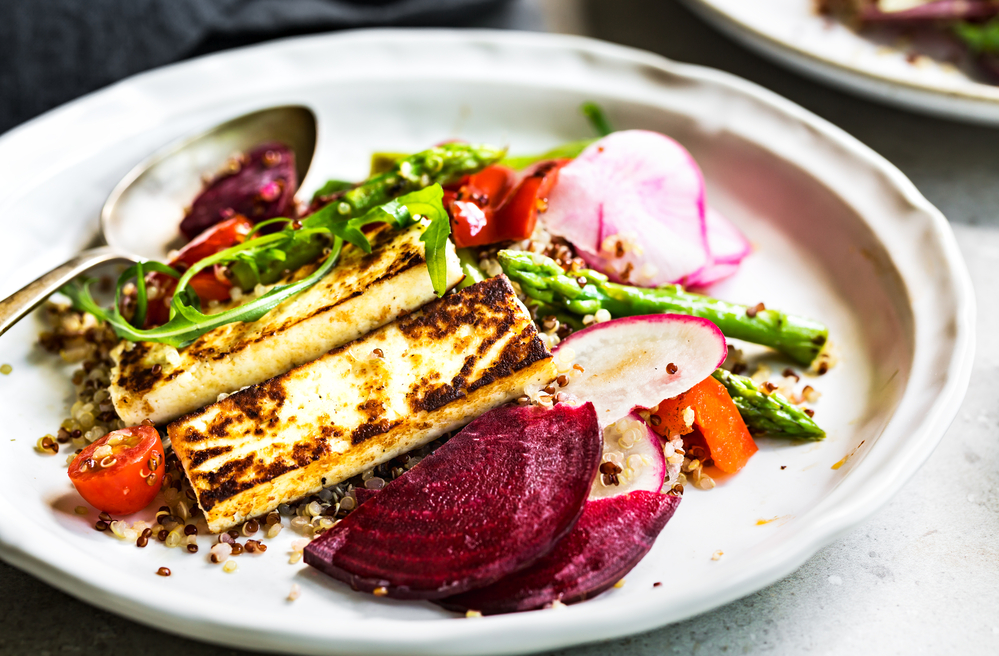 Жареный халуми с салатом из свеклы, глазированной апельсиновым соком
