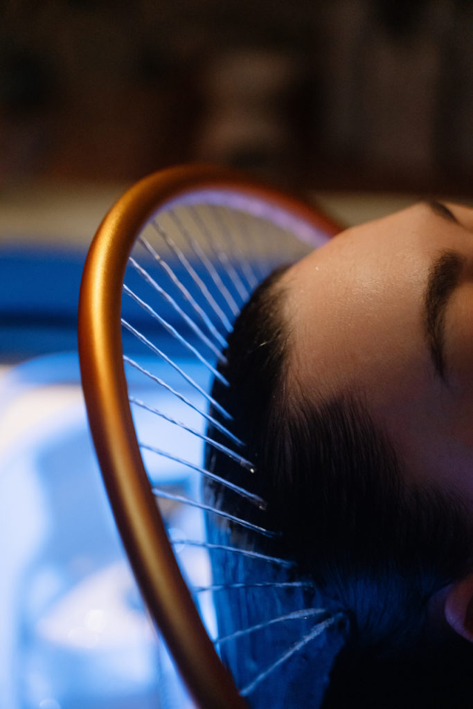 Дальше ложишься на кушетку – она выглядит как обычная массажная, только голова располагается на специальной подставке, а под головой емкость, куда сливается вода. Идет тщательная пошаговая работа с головой и верхней частью плечевого пояса: для массажа используются нежные руки, массажные расчески, разные гаджеты красоты. Например, металлический миофасциальный скребок мощно прорабатывает волосистую часть кожи головы, а еще я очень почувствовала его в области боковой поверхности шеи. Идет расслабление зажимов, восстановление эластичности, улучшение кровообращения.