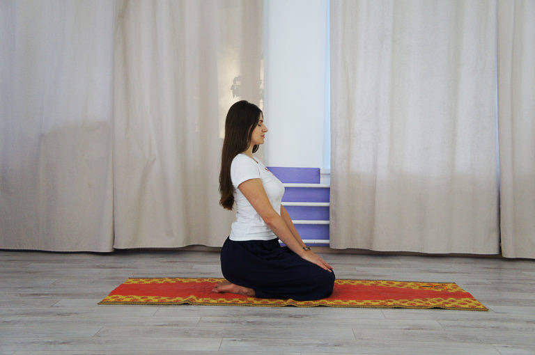 - Из ваджрасаны мы приподнимаем таз, скрещиваем лодыжки и усаживаемся поверх пяток. Колени разведены.