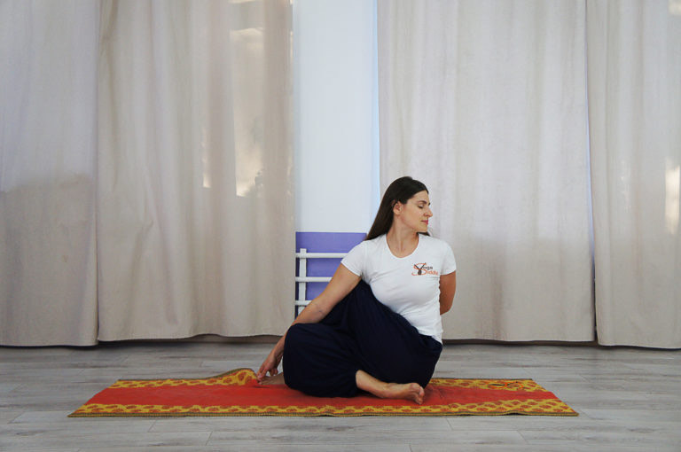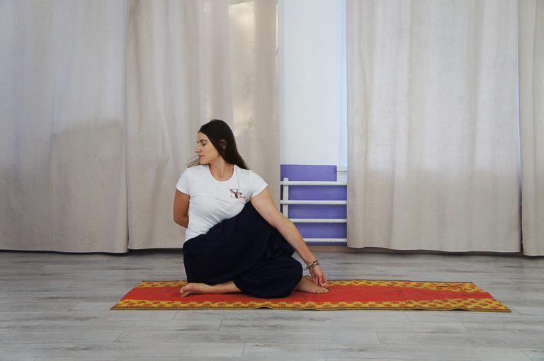 - Толкайте правое плечо назад, усиливая скручивание позвоночника