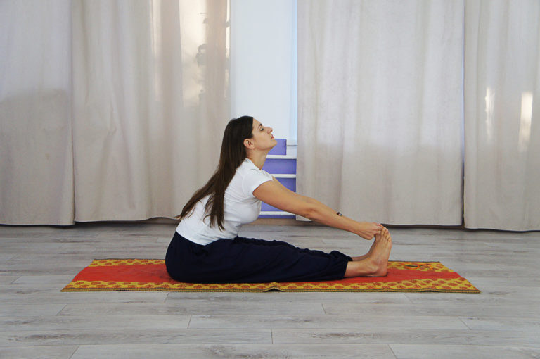 - Наклонимся вперёд и постараемся дотянуться до пальцев ног. Если получается, захватить большие пальцы ног в кольцо из среднего и указательного пальцев рук.