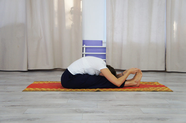 - Колени остаются прямыми, толкайте их к полу, дыхание постепенно замедляется