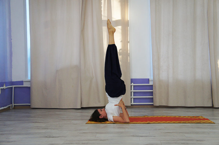 - В этой позе мы используем силу тяжести для того, чтобы кровь притекла к грудной клетке и к горлу