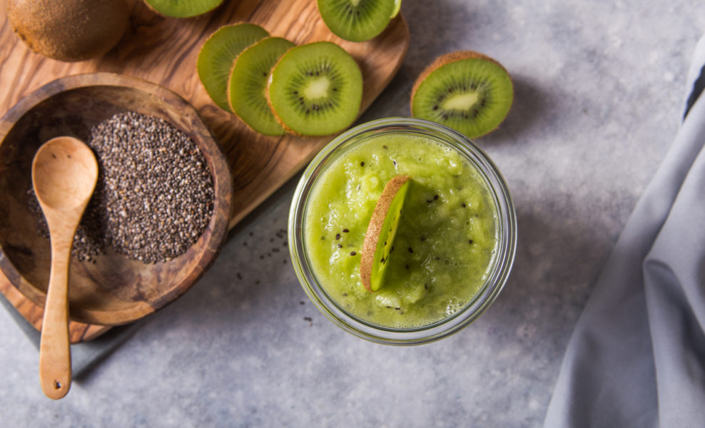 - В красивый стакан или пиалу кладите слой семян чиа – слой киви – слой йогурта.
