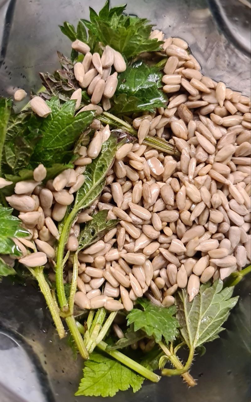 - Смолоть в блендере листья крапивы, чеснок, семечки подсолнечника, растительное масло, сыр, соль.