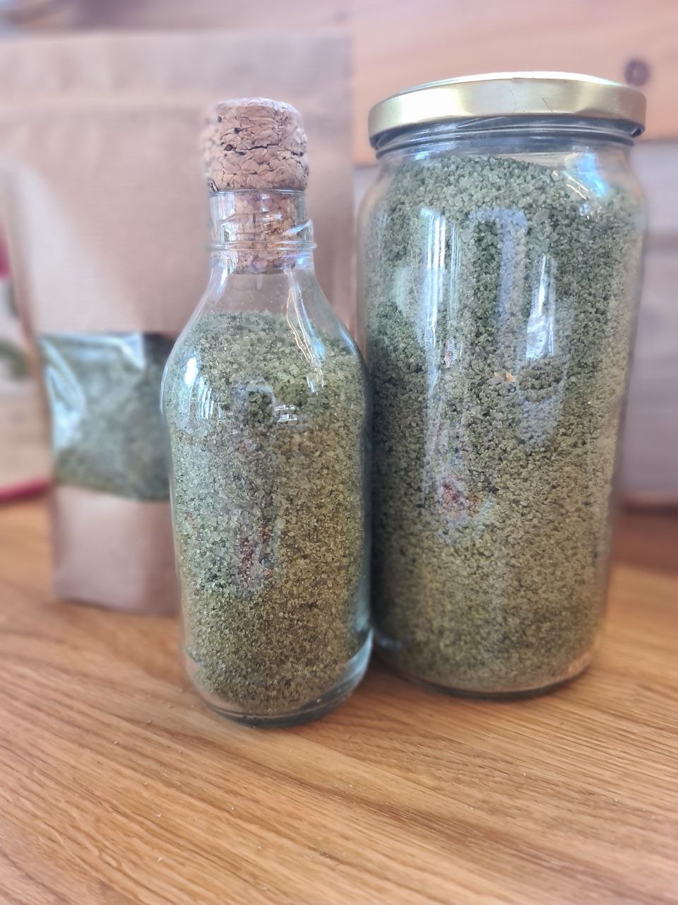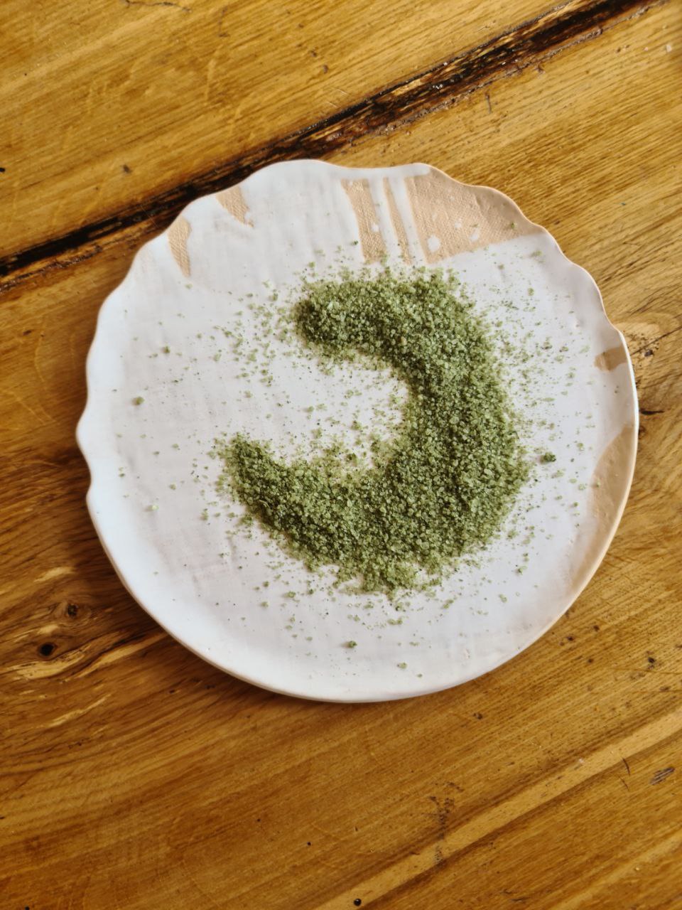 - Крапиву (и другие дикоросы, по желанию) пробить в блендере с добавлением небольшого количества воды, вылить полученную кашицу на соль, лучше брать морскую среднего помола, и перемешать.