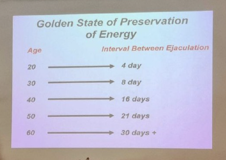 Слева – возраст мужчины, справа – количество дней, необходимых для перерыва между половыми актами с эякуляцией. Этот перерыв необходим обоим партнёрам, чтобы успевать накопить энергию и заниматься любовью на пике своих жизненных сил. Сроки, конечно, примерные. Публикую эту табличку не для того, чтобы вы пересылали её своим мужчинам. Для них не будет авторитетным мнение из группы женских Даосских практик. Публикую её для ваших размышлений о природе сексуальности, о том, что вообще для вас секс.