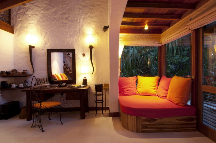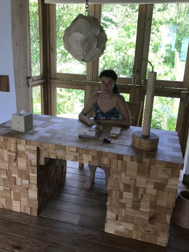 60 вилл разного размера. В нашей было две спальни, гостиная, ванная на улице, душ в джунглях, вид на маленький бассейн и океан. Когда мы вечером возвращались, в зоне отдыха на вилле уже горели свечи – наш Пятница трепетно относился к созданию атмосферы. Сону считает, что в таком месте можно легко попасть в состояние потока – и поэтому повсюду в комнатах лежат деревянные ручки и бумага, чтобы всегда можно было записать гениальную мысль или творческую идею, которая пришла тебе в голову.