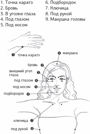 Билазариан говорит, что существует девять общих точек для таппинга лица: боковая часть руки, макушка головы, внутренняя часть брови, внешняя часть глаза, области под глазами, под носом и под губой, ключицы и подмышки. Если вам хочется большего, можете также уделить внимание точке, которая называется «точка гаммы» и находится на тыльной стороне руки между мизинцем и безымянным пальцем.