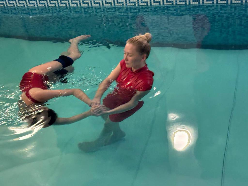 Спускаемся в воду комфортной для тела температуры. Обсуждаем: какая я сейчас и чего хочу с точки зрения цели и состояния. Подбираем поплавки, которые не дают ногам тонуть во время сеанса. Ложусь на воду и закрываю глаза, чтобы довериться и расслабиться. Отпускать контроль и тренировать доверие – это, пожалуй, главное для меня сегодня. Конечно же, плавные перемещения в воде воздействуют на все тело, снимая физическое и эмоциональное напряжение, повышая подвижность и гибкость.
