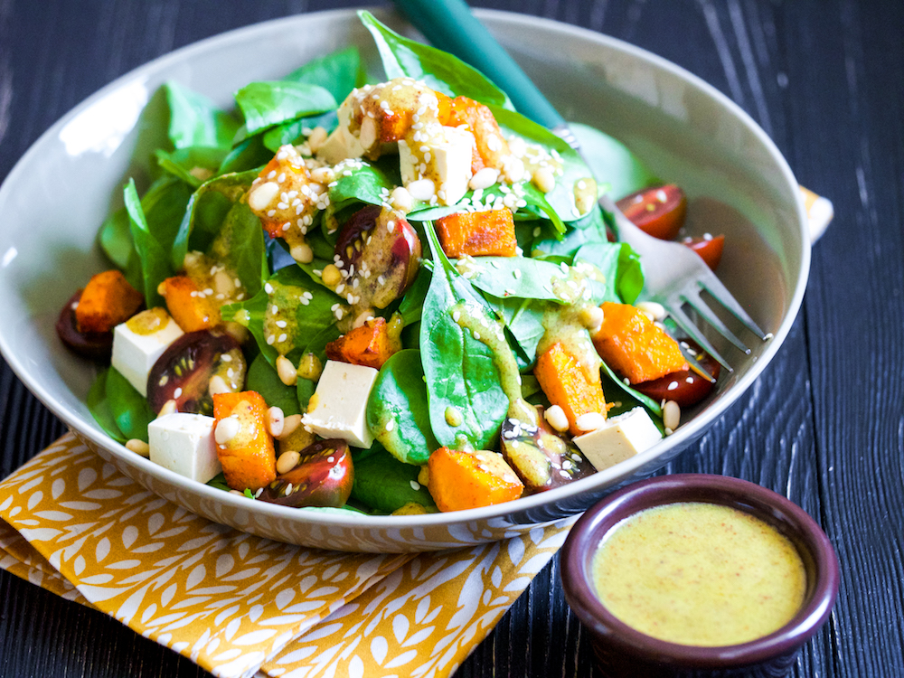 Поместите в глубокую тарелку или миску для салата листья шпината, помидоры, сыр и подрумяненную после запекания тыкву. Немного посолите, добавьте цедру лимона и семена кунжута.