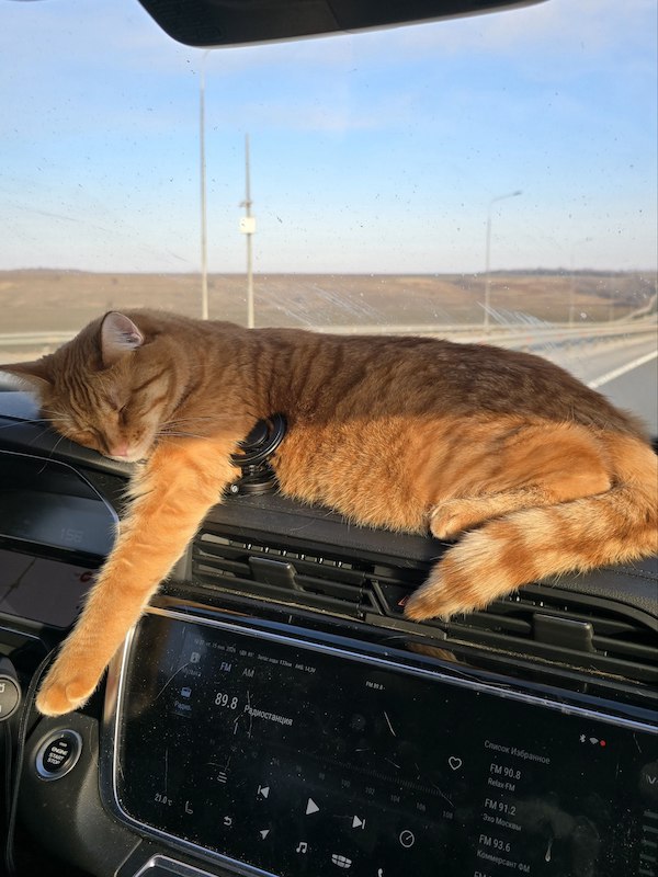 Мы едем домой, путь не близкий, занимает два дня, и наша дзен-кошка Люся демонстрирует гармонию за счёт своих великолепных адаптивных качеств.
