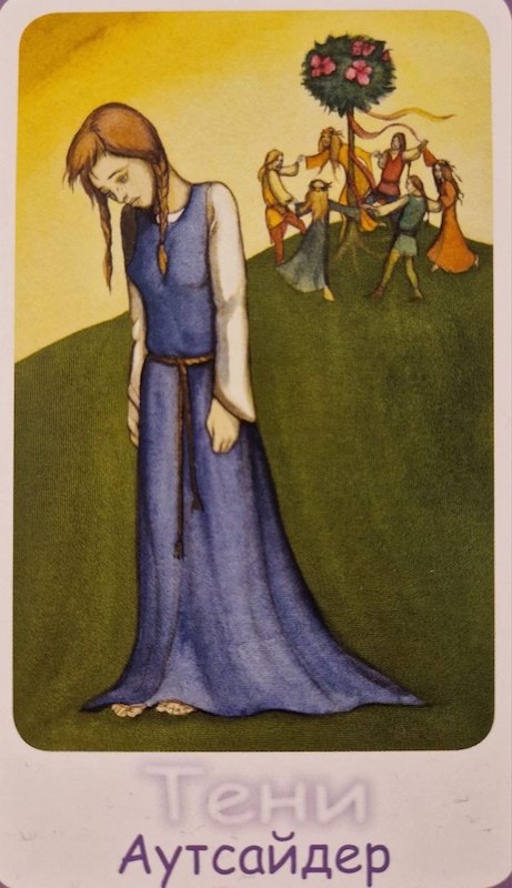 Вот, допустим, была сессия после того, как женщина вытащила карту Аутсайдер. Что мешает в отношениях? Эта позиция. Аутсайдер – это про разделенность с людьми. И слияние с родителями в их решении отвергать эту жизнь. Аутсайдер – это грусть об отсутствии хороших отношений с окружающими. Печаль о недостатке любви.