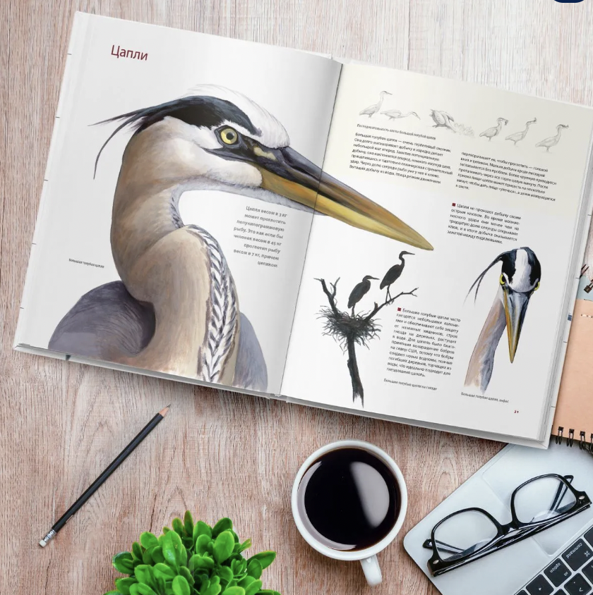 Путеводитель в мир птиц включает более двухсот видов и более 300 иллюстраций автора: запечатленные карандашом и гуашью, многие в натуральную величину, точны с научной точки зрения и очень живые – идеально, чтобы рассматривать вместе с ребенком.