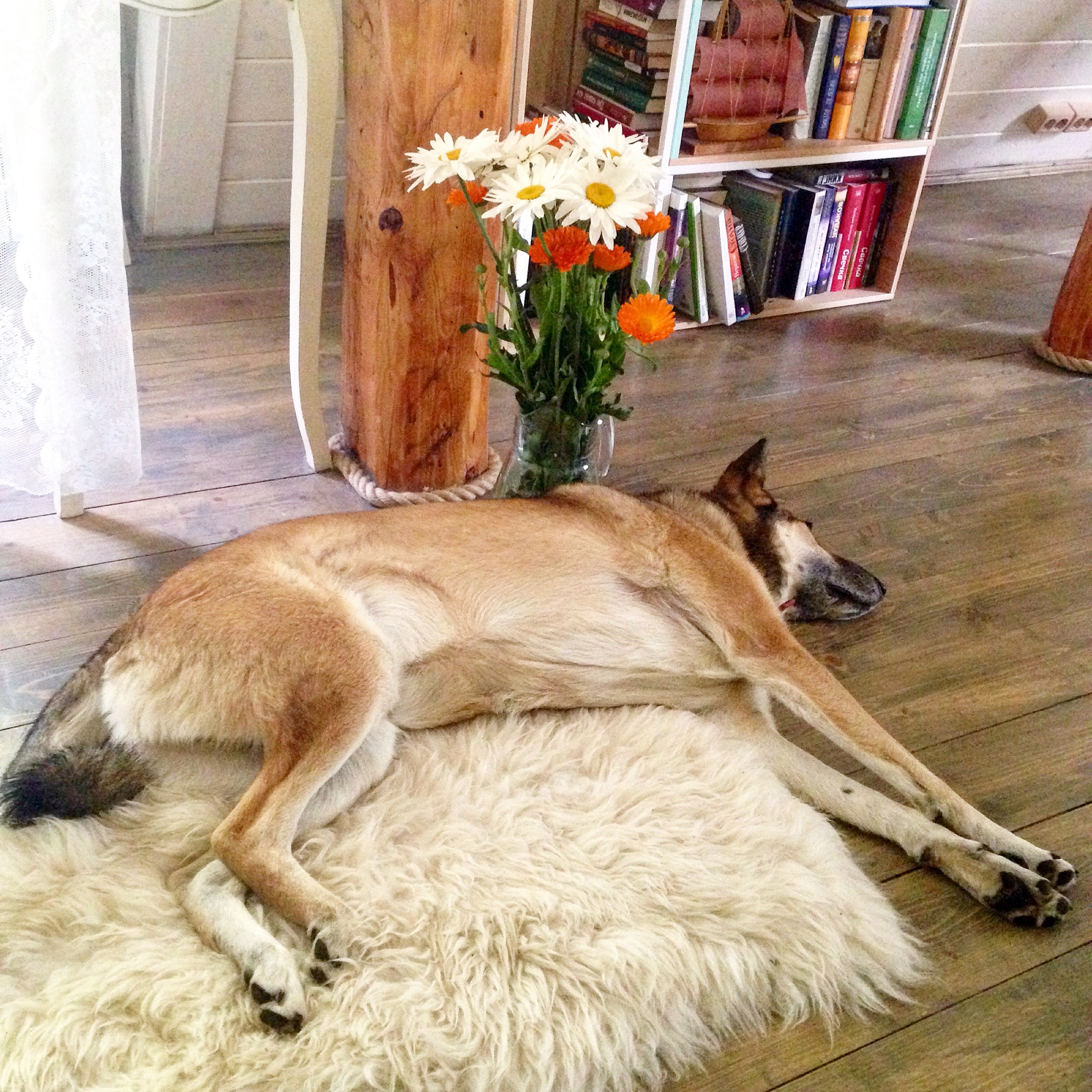 Вода камень точит, терпение завоевывает доверие, а любовь побеждает гнев. За полгода Фред расширил территорию влияния, сначала перебравшись в сени, потом в дом, а потом и в спальню, на второй этаж. Нет, на кровать я его не пускаю, но знаю, что в мое отсутствие он любитель поспать на раскладушке в беседке, на козетке на террасе и на диване в срубе. И думает, что он охрененно умный, потому что даже намеком не посягаяет на эти мягкие поверхности, когда я дома.