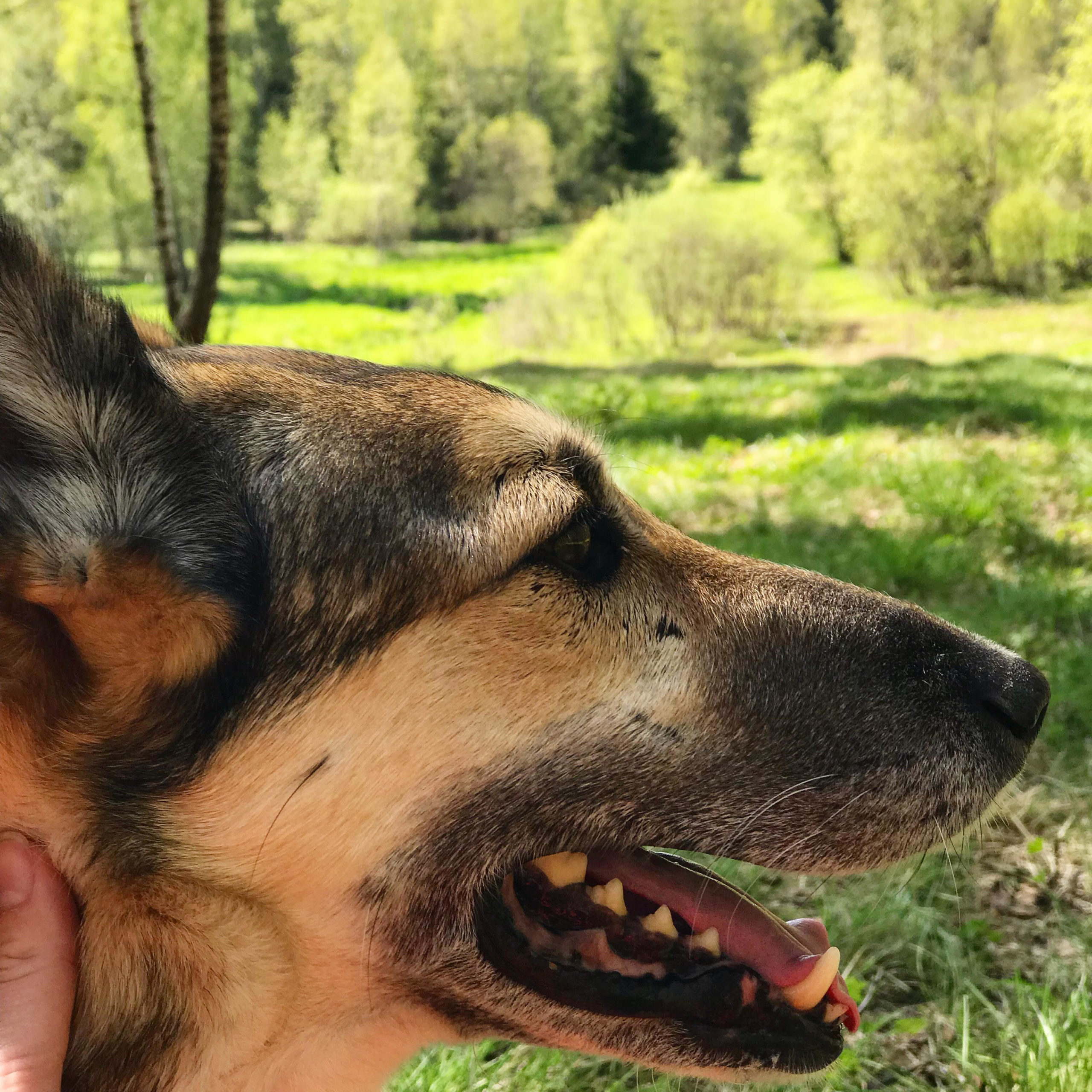 Сломанные пополам два клыка слева (явно кто-то засадил с ноги), порванное ухо, шрам на морде, — несмотря на это и на то, что собака мне пока не доверяла, потому что не знала, он сразу был добр и готов общаться.
