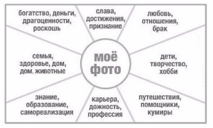 Клейте все, что соответствует вашим желаниям: пара – любовь, девушка в позе лотоса – гармония, монетки – благосостояние, красивая одежда и косметика, пальмы на фоне моря и т.д. Можно клеить как вам хочется, можно разделить лист на сферы: